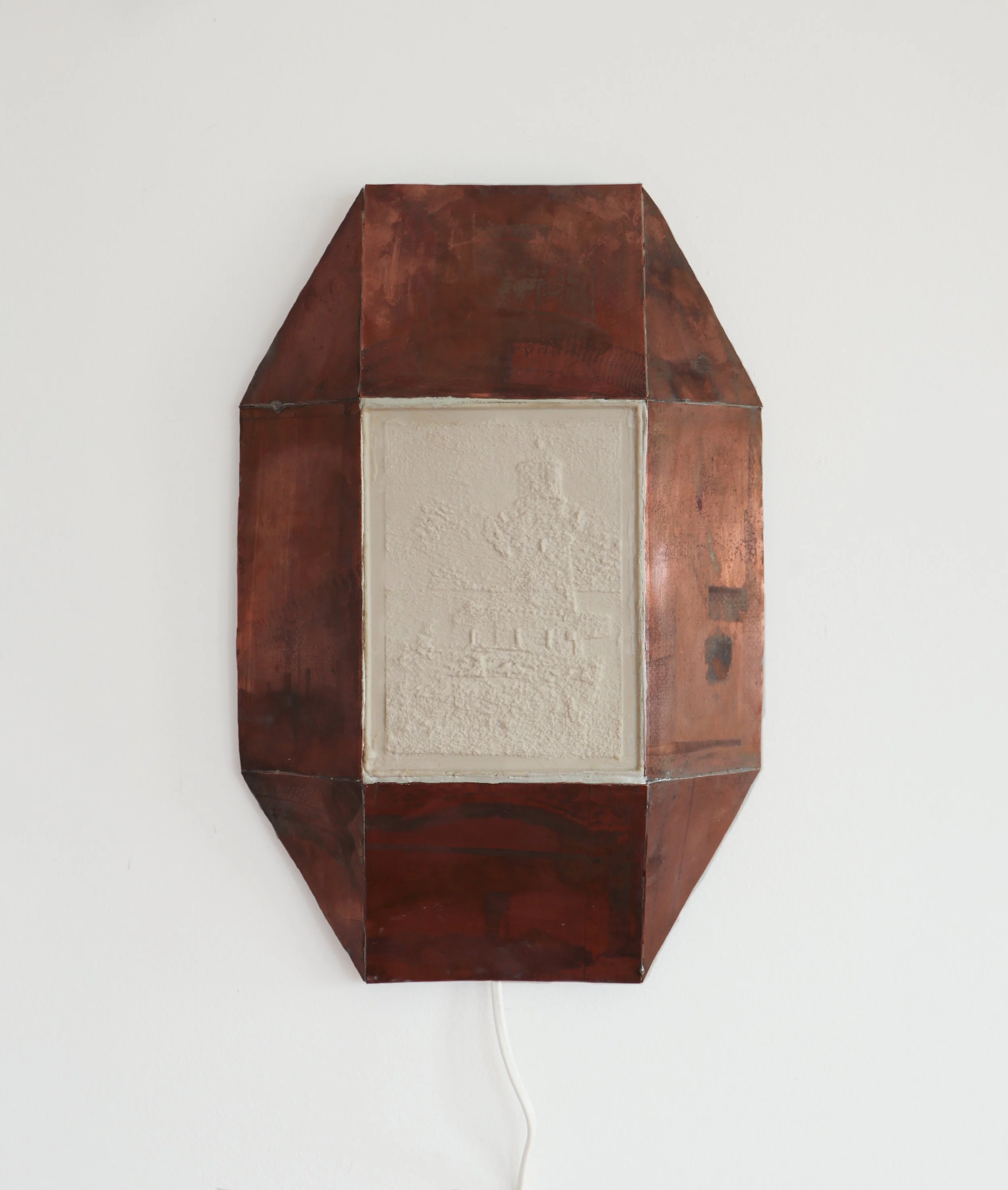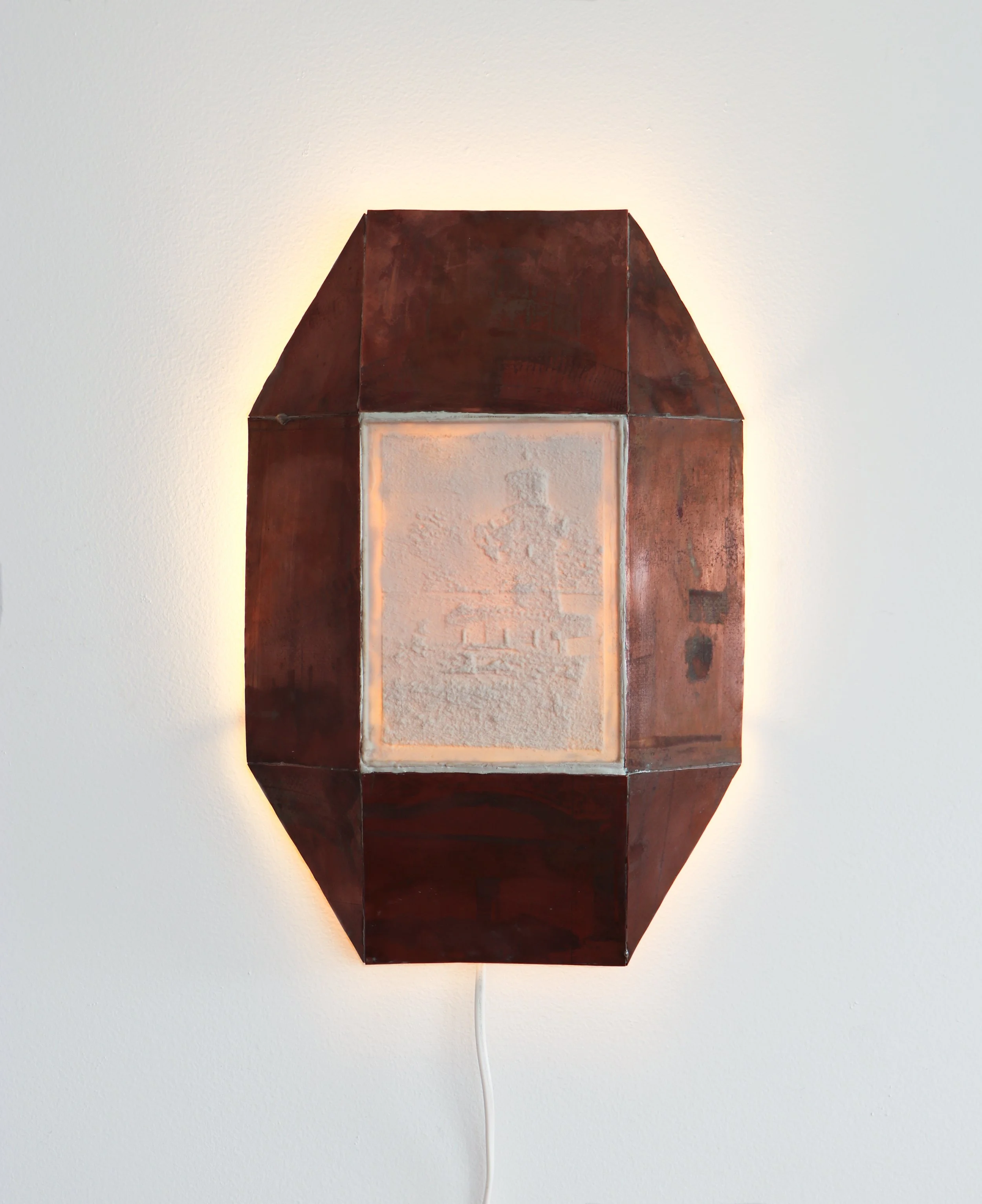 Porcelain lithophane, etched copper, silver solder, epoxy, lamp fittings